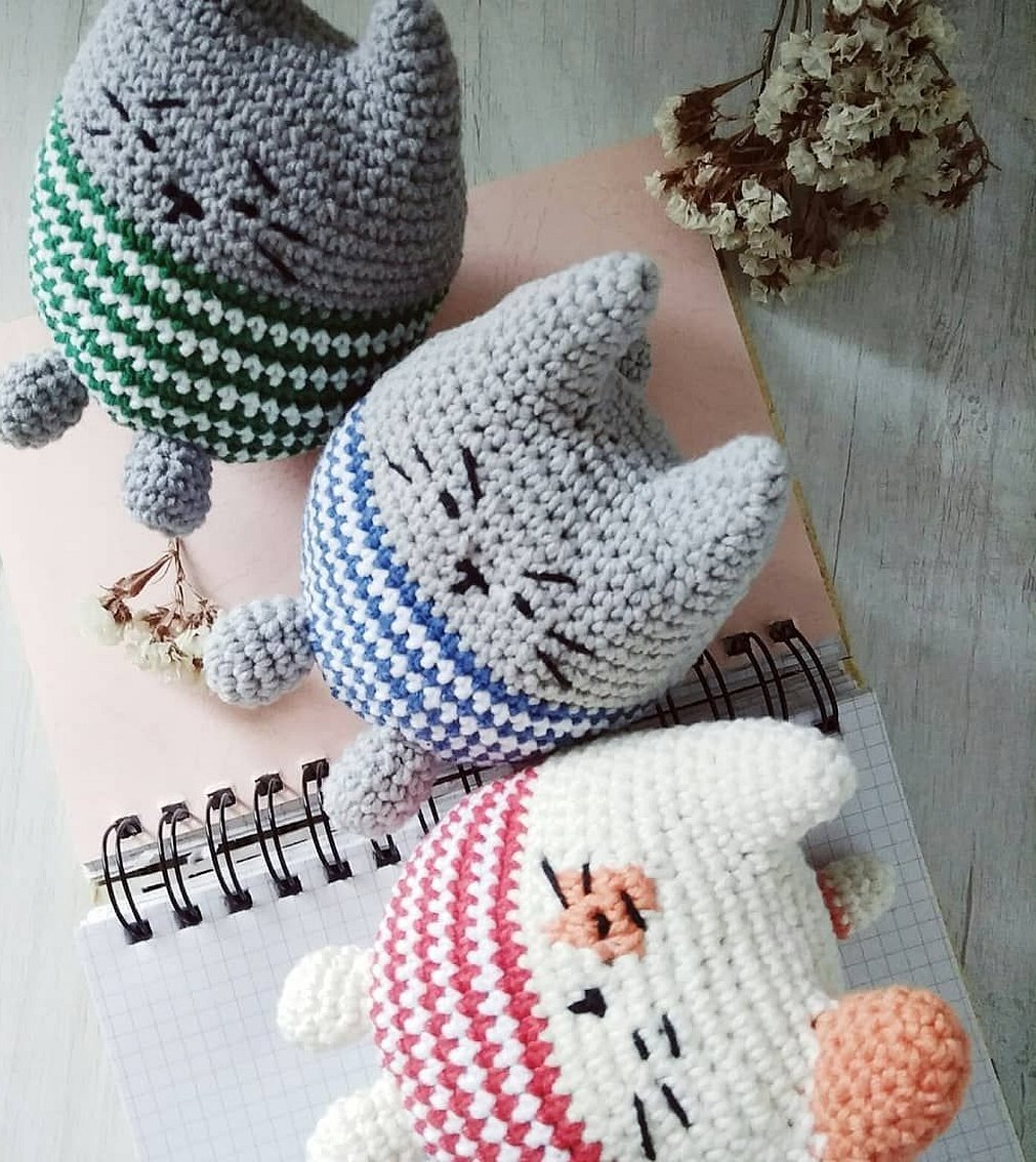 Для мастериц, владеющих крючком, вязание кота будет происходить немного по-другому. Изделию изначально следует задать окончательную форму – шар, цилиндр или иную фигуру. Потом ее останется лишь набить наполнителем.