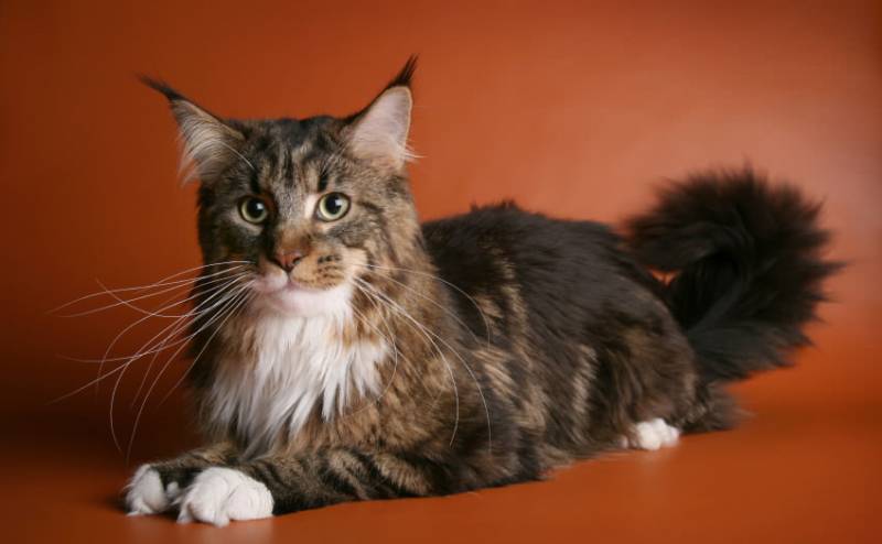 Полосатый кот породы мейкун обладает яркой внешностью и необычным характером. У животного крепкое телосложение и яркие выразительные глаза. Вес самца достигает восьми килограмм, что позволяет причислить породу к самой крупной из существующих.