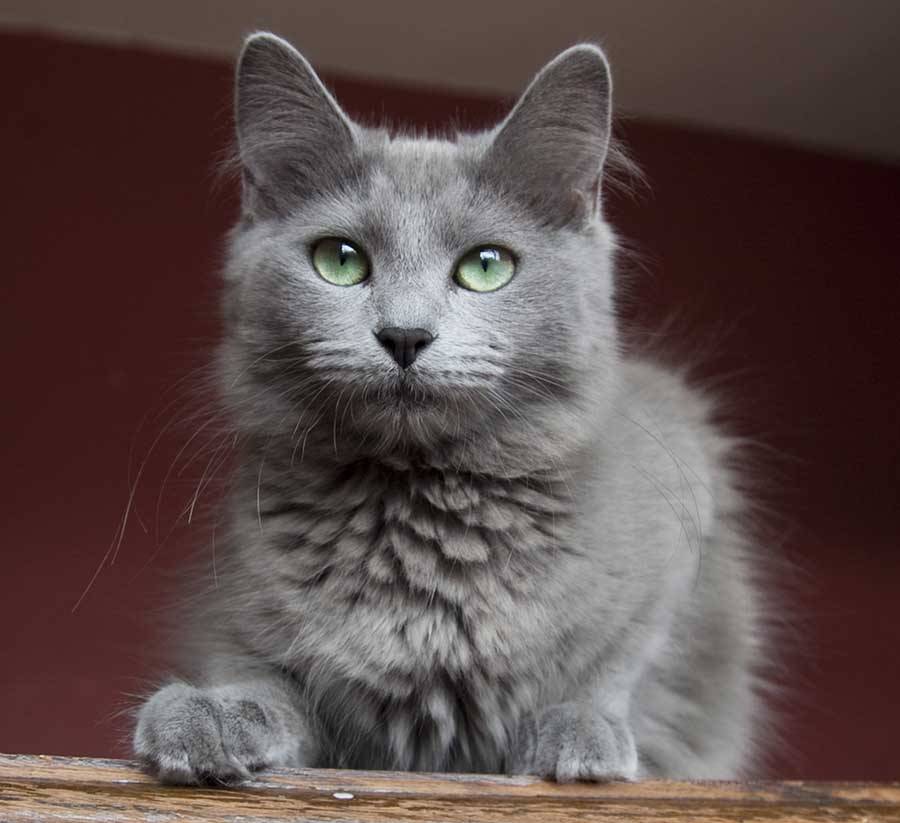 Очень редко встречаются кошки и коты с зелёными глазами породы нибелунг. Это красивое название в переводе с немецкого означает «туман». Нибелунги — это длинношёрстный вариант русской голубой кошки, и они действительно имеют много общего, например, изумрудно-зелёный оттенок глаз и голубую шерсть с серебристым типпингом — самый кончик каждого волоска обесцвечен, что и придаёт шубке красивый серебристый перелив.