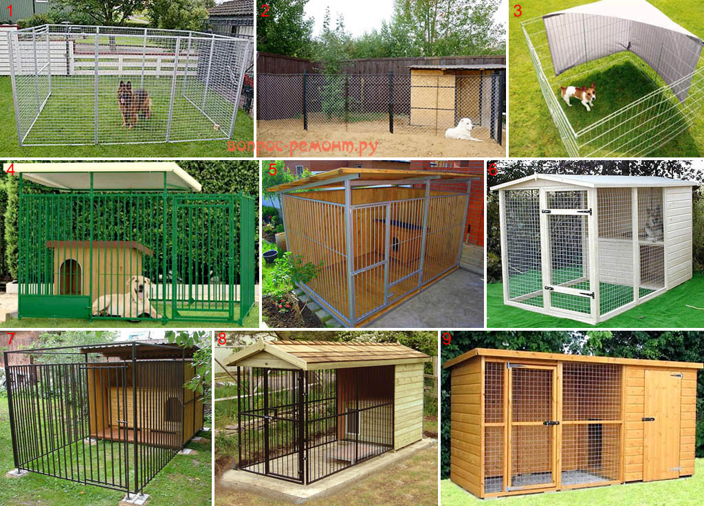 - временный. Недорогой вариант. Обычно используется летом на даче или для временной передержки собаки. Для изготовления используют сетку или забор. Внутри ограждения располагают будку или делают настил;