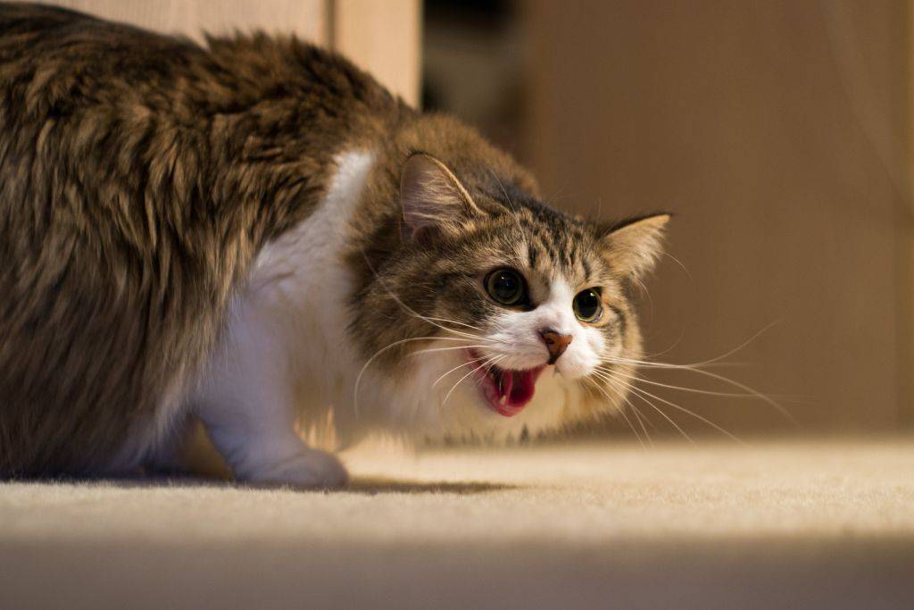 Защищая свою территорию, кошка начинает шипеть и кусаться.