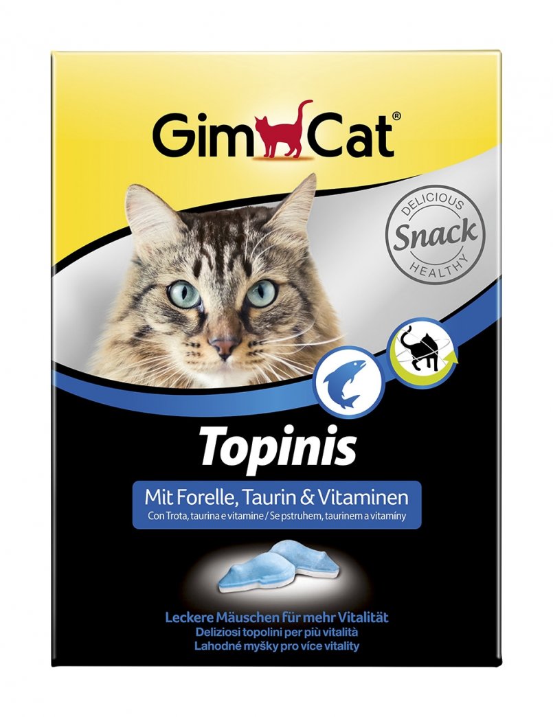 Любимое кошачье лакомство «Gimpet Topinis» содержит витамины A, B1, B2, B6 и B12, D3, C и K. Поедая симпатичных разноцветных мышек, кошка получает все, что необходимо для укрепления ее иммунитета.