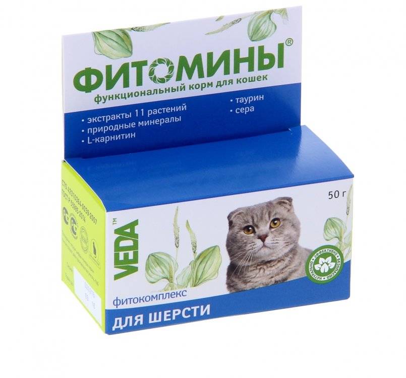 - Для улучшения состояния шерсти и кожи. Этот комплекс применяют во время линьки, после дерматитов или грибковых заболеваний, а также в нём нуждаются длинношёрстные породы кошек. В него включены витамины B-группы, биотин, таурин и полиненасыщенные жирные кислоты Омега.