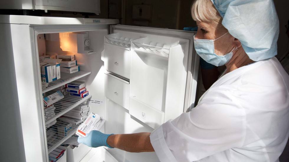 Прививки собакам делают в ветеринарном кабинете, предварительно вынув вакцину из холодильника.