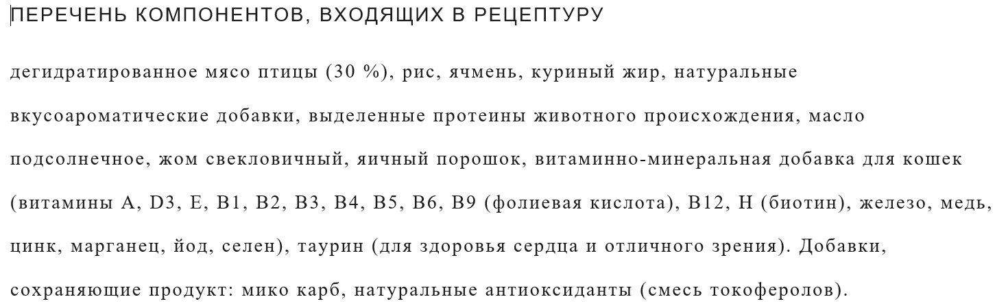 Ингредиентов немного, но все они подобраны тщательно: рис, например, не травмирует слизистую желудочно-кишечного тракта, а пищевые волокна облегчают процесс пищеварения.