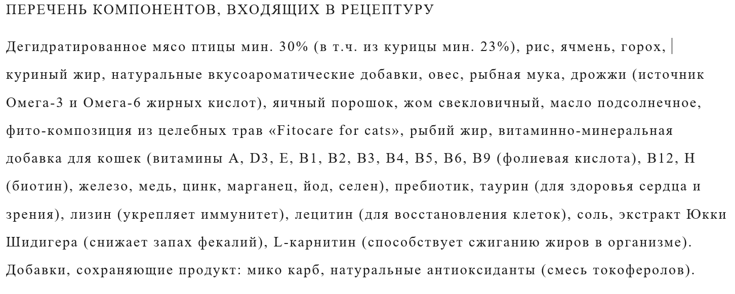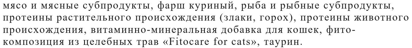 - среди ингредиентов есть овощи и крупы (клетчатка полезна для пищеварения кошки);