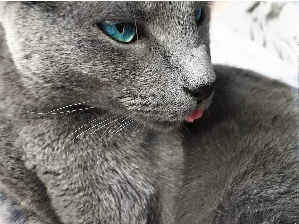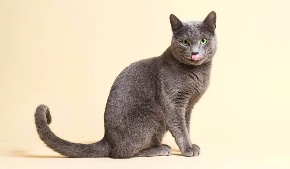 - Окрас. С окрасами русской голубой кошки все предельно ясно. Для данной породы свойственен сплошной серо-голубой цвет без рисунков и вкраплений. Может встречаться небольшая «полосатость» на хвосте.
