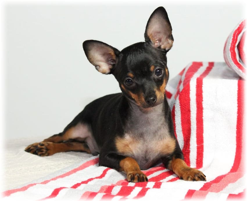 А вот у представителей короткошерстных той-терьеров, шерстинки короткие, хорошо прилегают к коже, образуя равномерный блестящий покров. Окрас русского тоя практически всегда подпалые, с преобладание черного, коричневого, рыжего или голубого оттенка. Цвет же самого подпала – черный или коричневый.