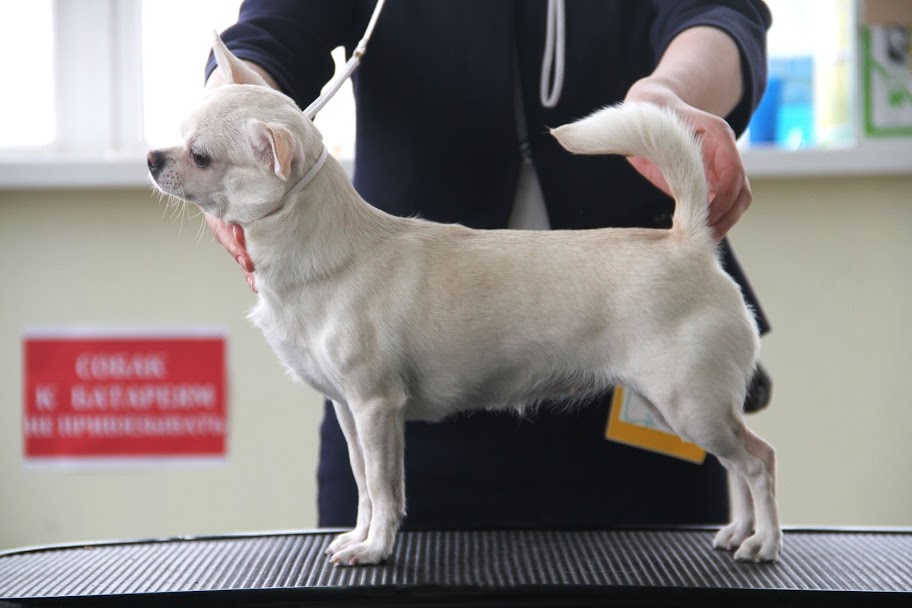 Выставочную собаку чихуахуа заранее готовят к показу: приучают к стойке, показу зубов, равнодушному отношению к специальному столику.