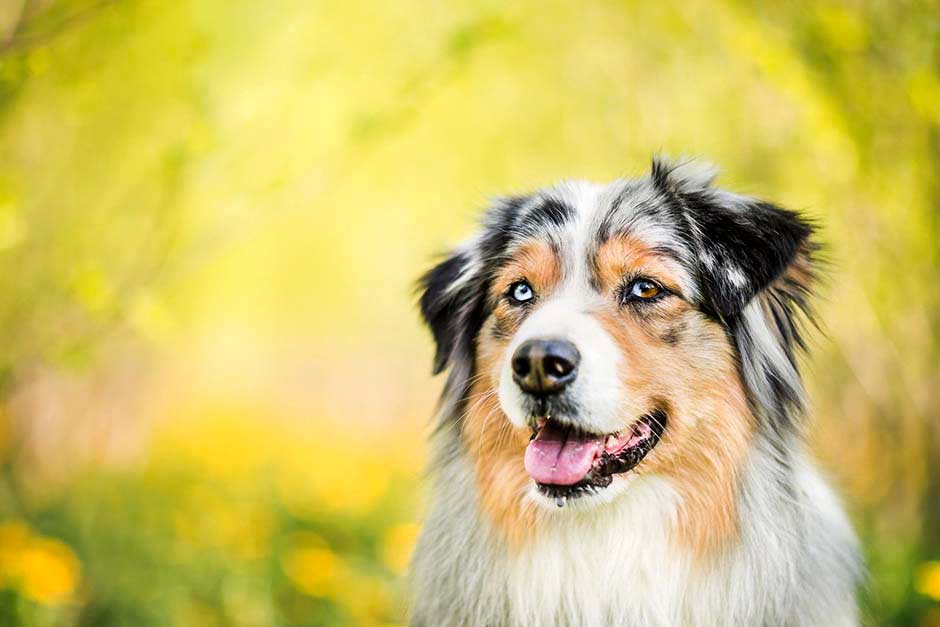 У австралийской овчарки выразительные глаза миндалевидной формы. Радужка допускается разного окраса: коричневого, голубого, желто-оранжевого или смешанных оттенков. У аусси нередко бывает гетерохромия – глаза разного цвета. Это не является пороком. У собак черной и серо-голубой масти края век черные, у окраса ред – коричневые.