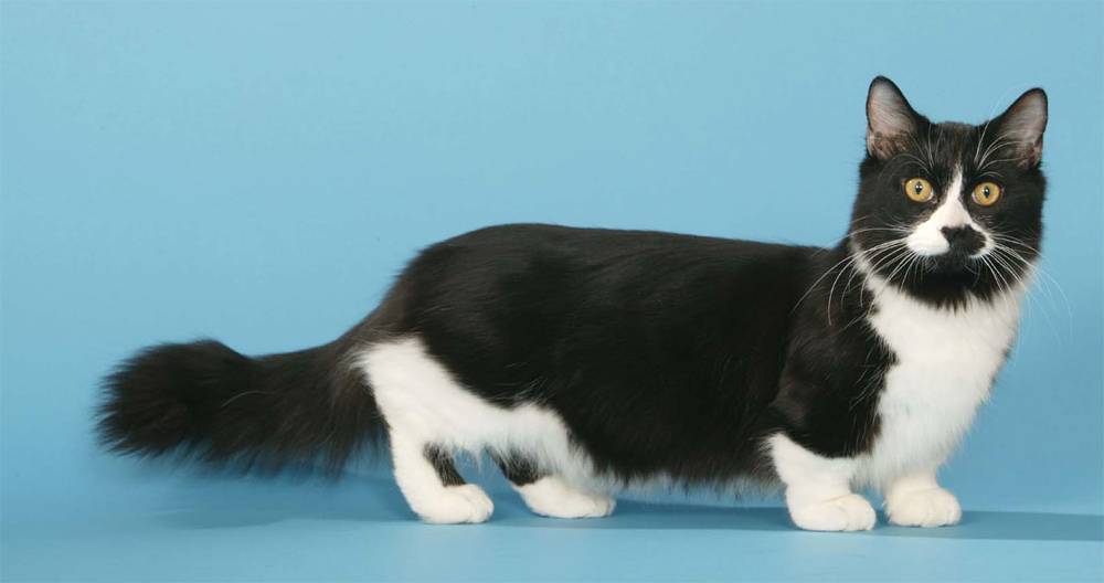 Довольно странная порода кошек. Стандарты внешнего вида которой не являются общепринятыми до сих пор. Манчкины обладают телом нормальных размеров, но при этом оно держиться на лапках раза в 3 короче обычных. За столь необычные пропорции их называют «кошачьими таксами». Могут быть разных окрасов, с пятнами на шее в виде медальонов.