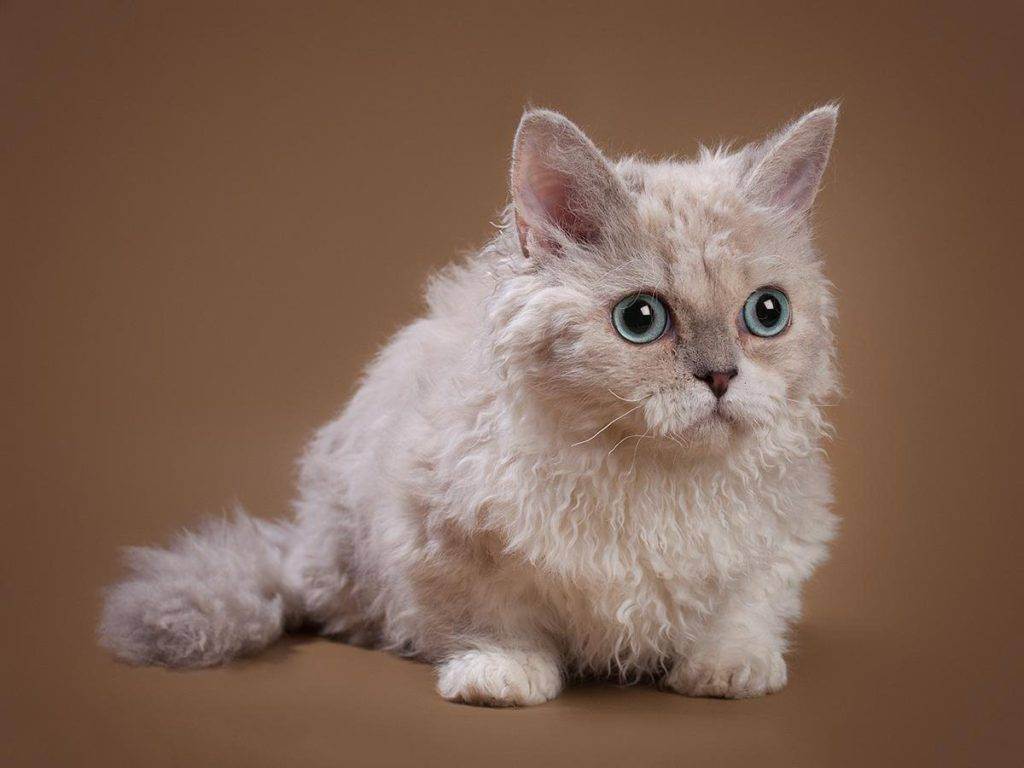 Скукум – порода, полученная американцем Роем Галушем в 90-х годах прошлого века. Он скрестил манчкинов с лапермами и получил кудрявых малышей. Шерсть взрослых кошек длинная и волнистая. Миниатюрные питомцы весят примерно 3,5 кг.