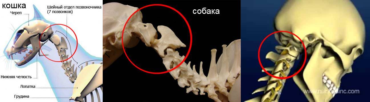 Позвоночник кошки начинается с шейного отдела и состоит из семи позвонков. Особенность шейных позвонок в их размерах и возможности поворота на 180 градусов. Первый позвонок имеет специфический вид, называется атлант и крепиться непосредственно к черепу животного. Второй шейный позвонок – эпистрофей, также не похож по строению на обычные позвонки.