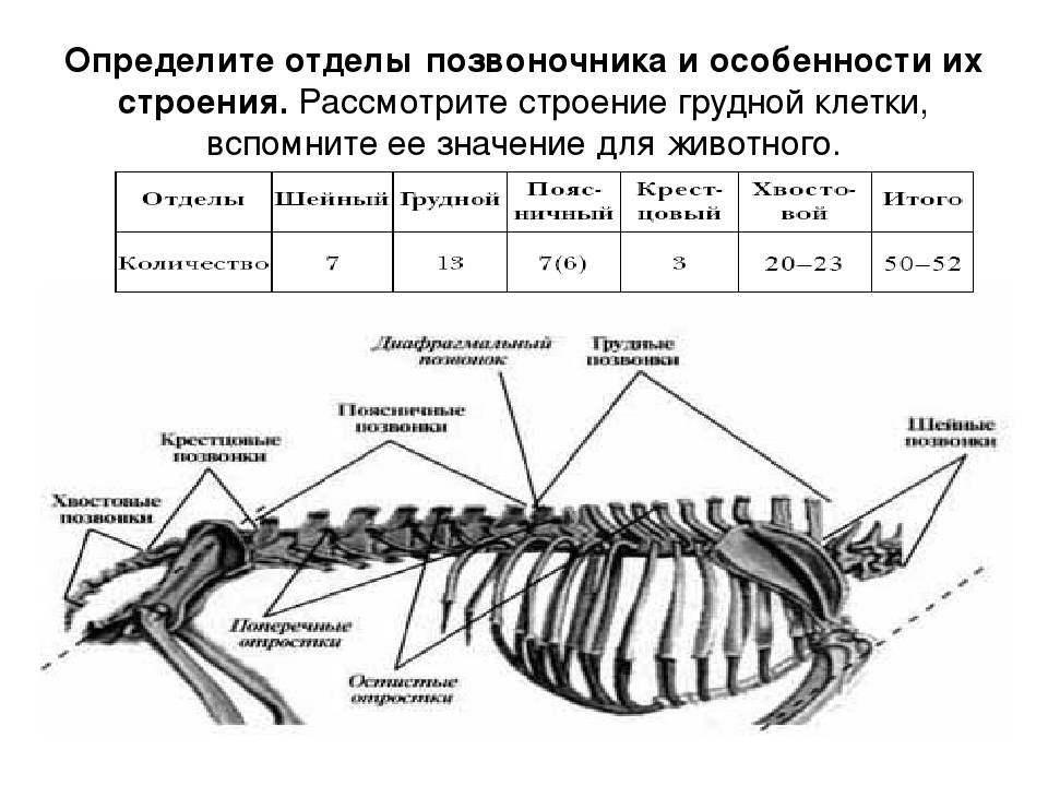 Шейный отдел плавно переходит в грудной и состоит уже из 13 позвонков, имеющих специальные выемки для крепления истинных ребер, имеющих специфическое удлинение к хвостовой части. Всего истинных ребер у кошек – 16, остальные же пять пар являются ложными и не крепятся к позвоночнику.