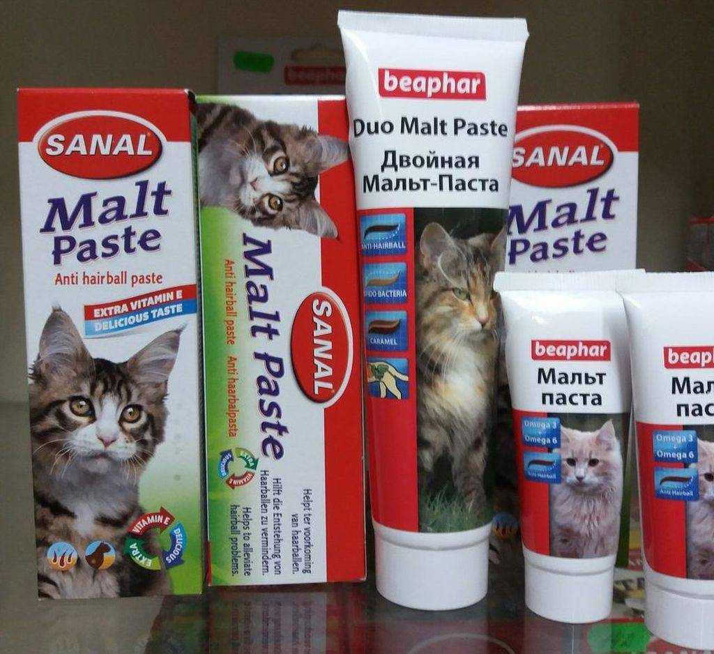 Чаще всего применяются мальт-пасты BeapharMaltPaste, GimCatMalt-SoftPasteExtra. Для взрослого животного достаточно 3–5 см состава 1 раз в день.