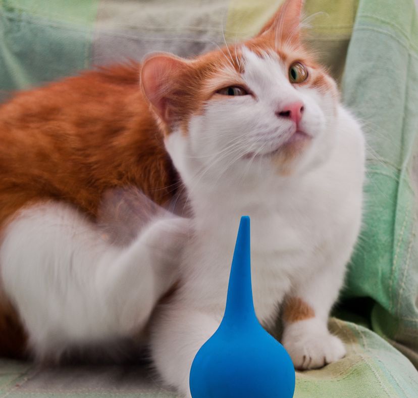 - Приобретается специальная клизменная груша для кошек. Ее кончик смазывается вазелином, чтобы не повредить стенки анального отверстия животного.