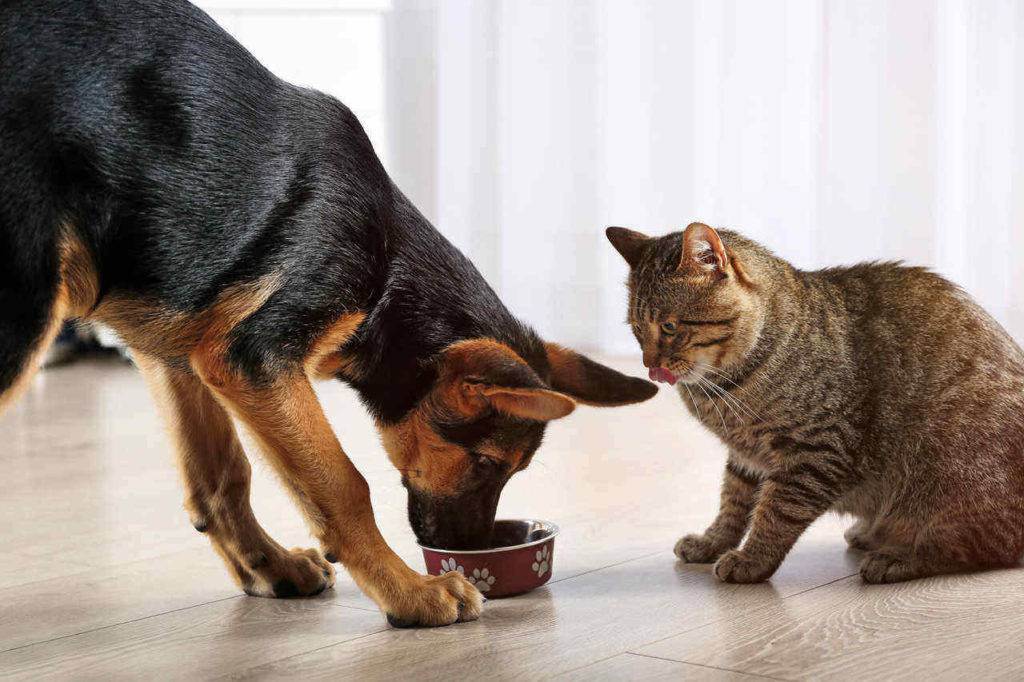 Если в семье живут пес и кот, они будут воровать друг у друга еду. Чтобы этого избежать, нужно кормить животных по очереди. Если это не помогает, миски расставляют по разным комнатам. Еще один действенный способ: поставить миску на высоте, куда не доберется собака.