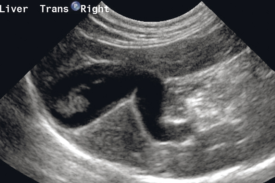 Обратите внимание на круглый, тонкостенный, анэхогенный желчный пузырь, расположенный в правой части печени. Желчь в желчном пузыре анэхогенна