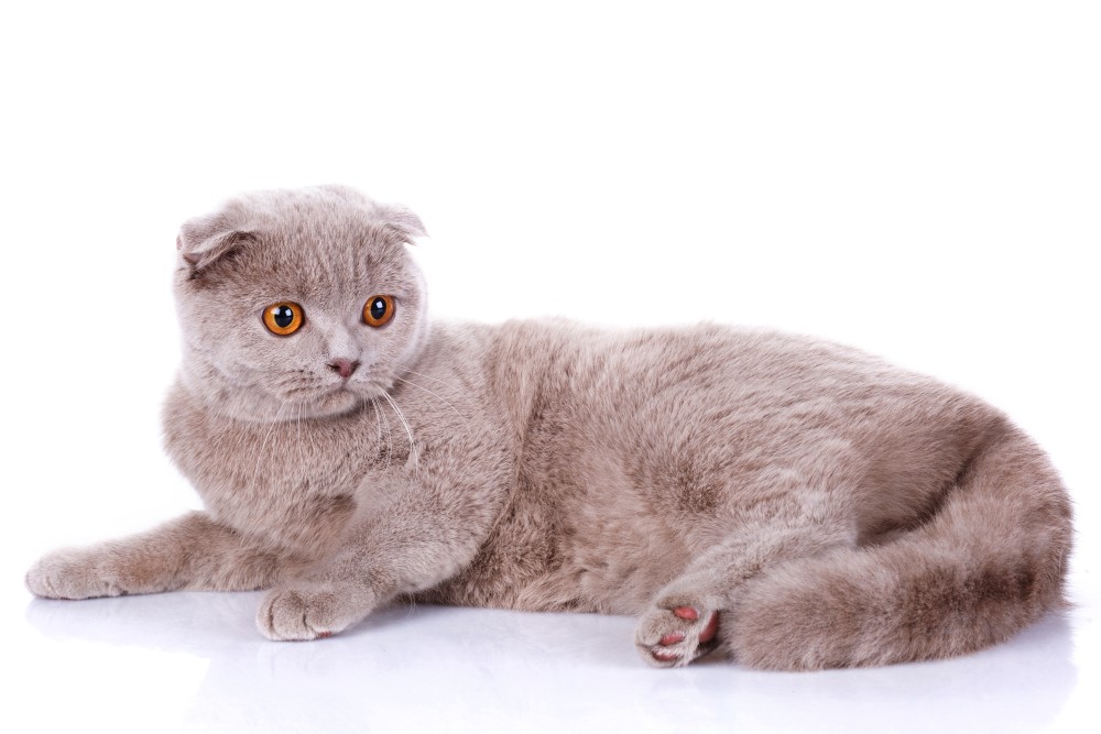 У однотонного лилового вислоухого шотландца нежно-серый оттенок плавно переходит в кремовый.Нос слегка коричневатый, лапки снизу – в тон шерсти, гармонируют с основным цветом питомца. Такой лилово-лавандовый окрас прекрасно сочетается с глазами медных, янтарных или оранжевых оттенков.
