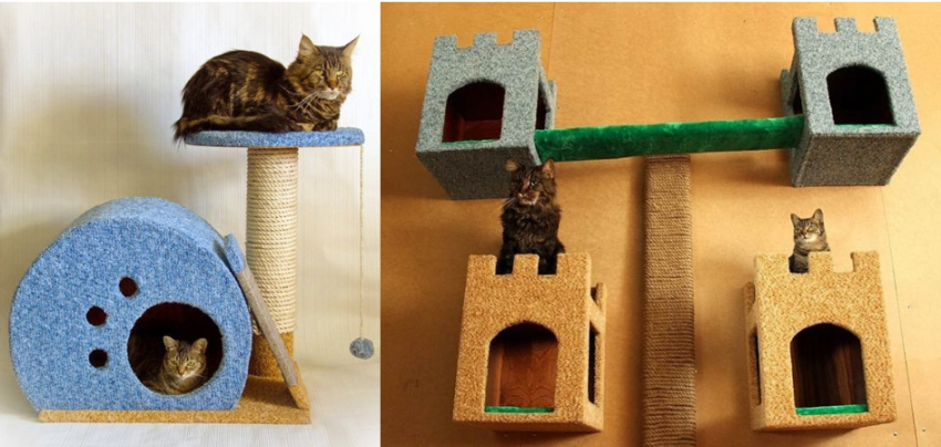 Создать своими руками игровой комплекс для кошки под силу умелым и заботливым владельцам. В отличие от готового сооружения, самодельное как нельзя лучше отвечает потребностям пушистого питомца и вписывается в интерьер. В него можно включить не только убежище для отдыха, но и лестницы, веревки, многоуровневые площадки, тоннели.