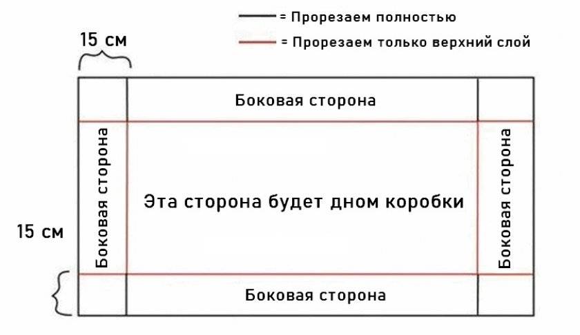- Надрезать размеченные линии, соединяющие боковые стороны. Между надрезами должен образоваться уголок, который нужно загнуть внутрь.