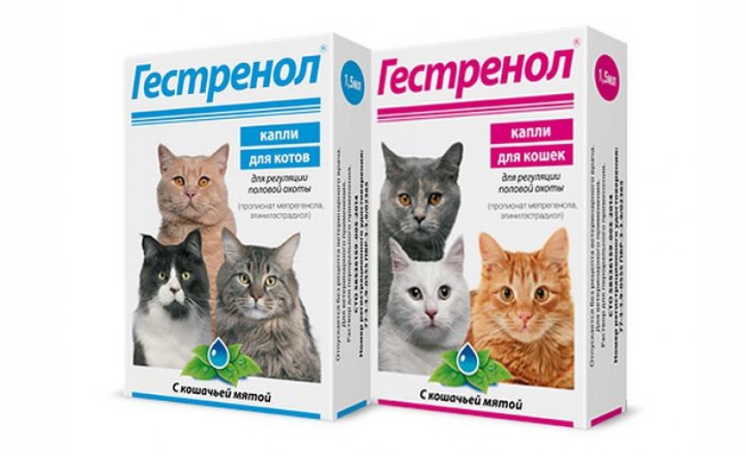 - Мепрегенола — «заменителя» природного гормона прогестерона, который снижает выработку лютеинизирующего (ЛГ) и фолликулостимулирующего (ФСГ) гормонов. Если использовать Гестренол у кошек до начала течки, то происходит угнетение выработки эстрогенов, стимулирующих процессы овуляции. У котов же происходит снижение выработки сперматозоидов и мужских гормонов.