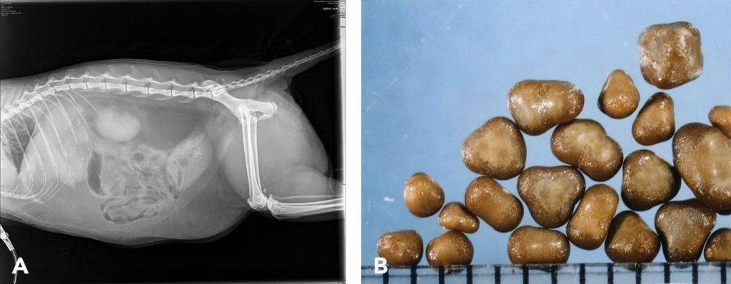 У кошек наблюдают два вида мочевых конкрементов: