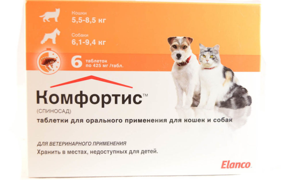 Комфортис. Инсектицид на основе природного токсина спиносад. Активное вещество всасывается в кровь из желудочно-кишечного тракта и приводит к возбуждению мотонейронов насекомых и их гибели. Дозировка рассчитывается исходя из веса кошки: 50 мг на 1 кг. При передозировке возможны следующие побочные явления: слабость, сонливость, отсутствие аппетита, рвота. Чтобы кот охотней проглатывал таблетку, они выпускаются со вкусом говядины. Цена зависит от количества таблеток и составляет 2000–4500 руб.