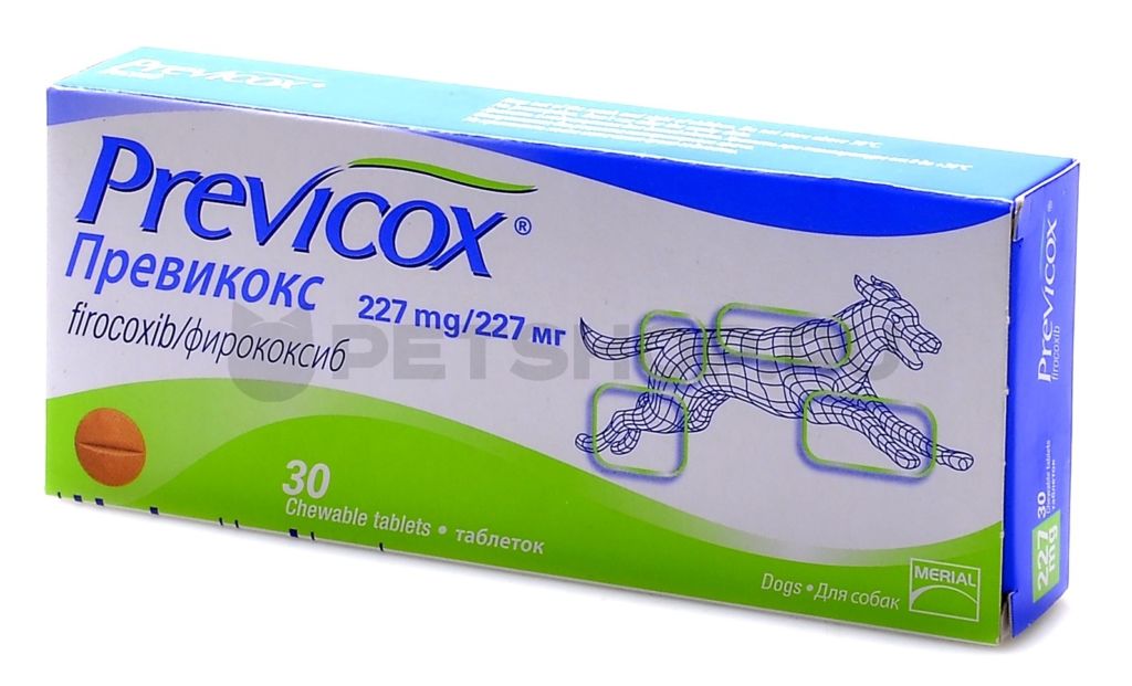 - Превикокс (Previcox). Препарат в виде таблеток. Основное действующее вещество – фирококсиб. Выпускается в двух формах: 57 мг и 227 мг.