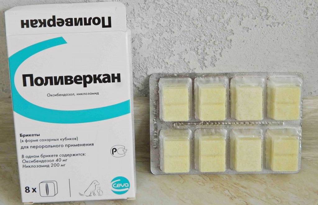 | Поливеркан | ООО «НВЦ Агроветзащита С.-П.» | Сахарные кубики для перорального применения | Никлозамид, оксибендазол | Повышенная чувствительность к ингредиентам антигельминтика, применение других препаратов с аналогичным предназначением | Выраженные нарушения работы печени | 4 |