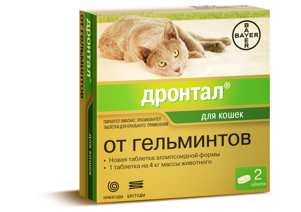 | Дронтал | «Вауег Animal Health GmbH» | Таблетки | Пирантела эмбонат, празиквантел | Вес менее 1 кг, беременность, прием препаратов, содержащих пиперазин | 3 | |