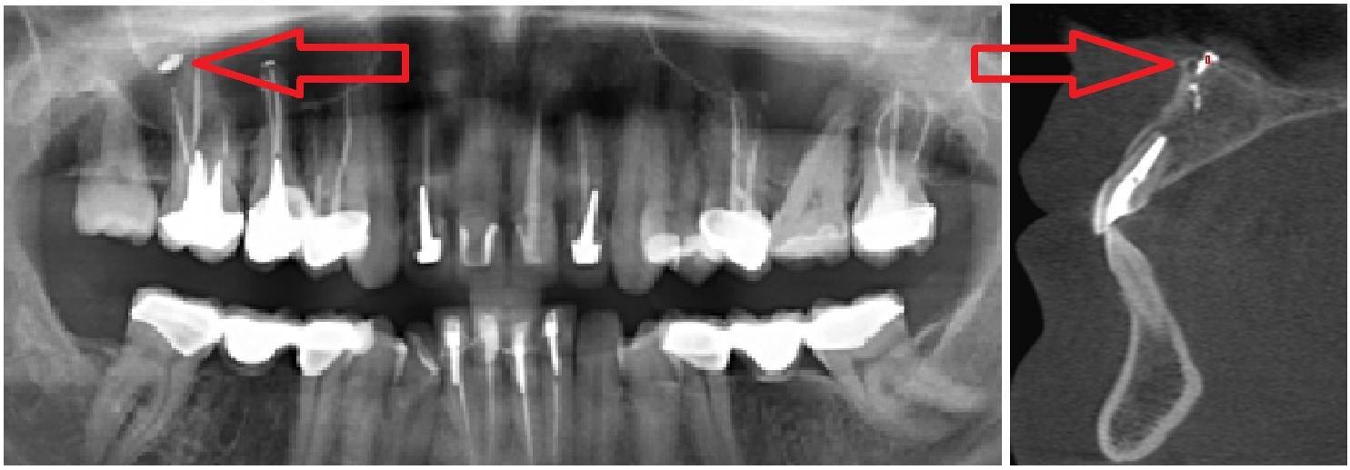 Стрелками показаны фрагменты пломбировочного материала (вид спереди и сбоку), который при пломбировании канала выпал за пределы зуба и «упёрся» в область залегания ветви тройничного нерва. У пациента долго болел зуб после лечения пульпита, затем онемела верхняя губа и часть щеки.