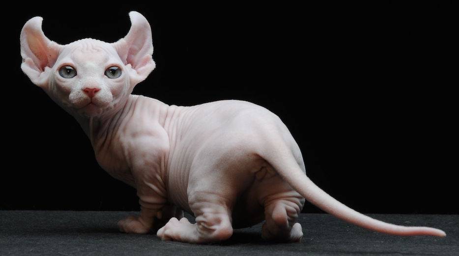 На теле этих кошек практически отсутствует шерсть или есть в виде небольших, еле заметных волосков. В этой редкой кошке со всех сторон просматривается элегантность, выражается она в стройном телосложении, удлиненной голове и внушительных размеров ушах, отведенными по сторонам.