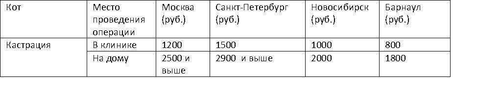 Таблица No 1 Примерная стоимость кастрации котов в разных городах РФ.