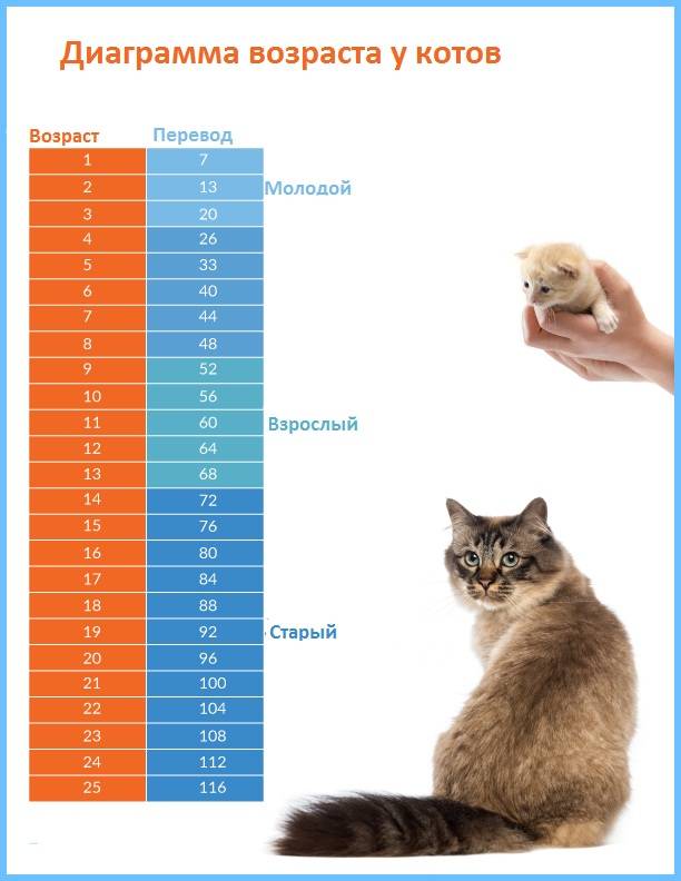 Как определить возраст кота в переводе на человеческий возраст и можно ли в принципе сравнивать этапы наших жизней? Самый примитивный способ – каждый кошачий год приравнивать к семи человеческим. Как посчитать возраст кошки учитывая особенности развития, присущие людям и кошкам? В этом случае таблица получится несколько сложнее. Первый год котёнка можно смело приравнять к 15 годам, второй – к 10, а каждый последующий считать за 4-5 лет. Чтобы узнать возраст кота старшего возраста, за каждый год после седьмого предлагается прибавлять по 3 «человеческих» года.