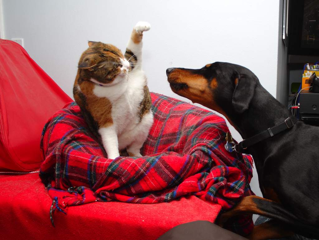 Важно помнить, что когда кошка бьет собаку «мягкой» лапкой, не выпуская коготки, не шипя и не прижимая уши – это форма игры, а не агрессия. Через несколько «занятий» питомцы усвоят, что веселье прекращается, как только они переходят обозначенную владельцем черту.