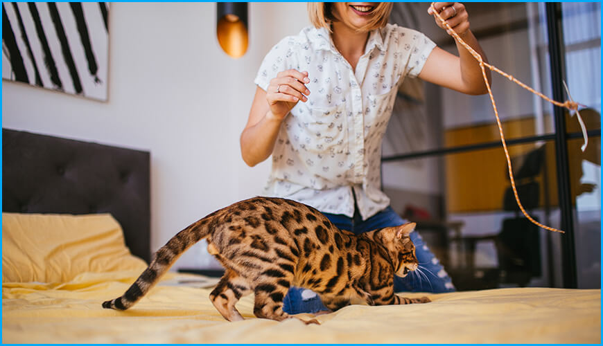 Эти животные даже в солидном возрасте любят играть, для подростков это самое любимое занятие. Нужно не только покупать котёнку игрушки, но и поучаствовать в таких развлечениях. Есть много разных приспособлений, заставляющих кошку заинтересоваться, начать весёлую игру: бантик на ниточке, движущаяся игрушка. Владельцы планшетов используют свои устройства для кошачьих развлечений. Многие питомцы быстро осваивают простые игры, в которых нужно «поймать» паучка, мышку и др.