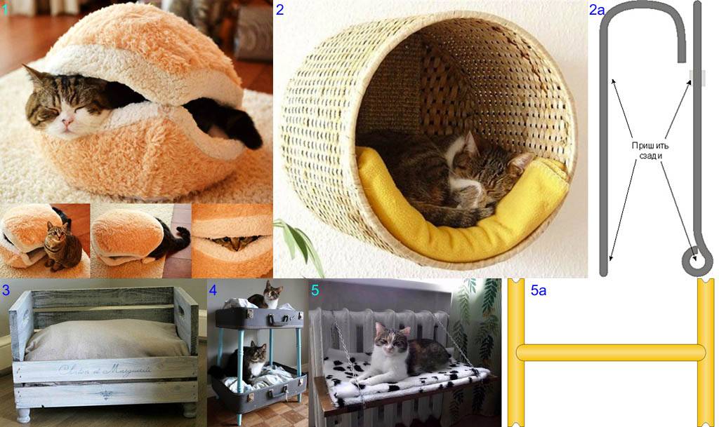 Для большой кошки с потомством или с надеждой на него хорошо подойдет лежак из досок, поз. 3. Еще лучше, в т.ч. для пары – из старых хозяйских чемоданов, поз. 4. Кстати, чемодан вообще-то нужен всего один: для верхней полки отлично подойдет его крышка.