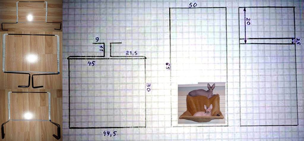 Лежанка на батарею для обоих полов кошачьей породы может быть сделана с мягким полотнищем из 6-мм проволоки-катанки и распоркой из алюминиевой проволоки потоньше (4-5 мм). Ее конструкция (крюки подгибаются по месту), чертеж и раскрой полотнища показаны на рис. Делать крюки поворотными не надо: уважающая себя кошка не станет лежать на чем-то хлипком и хлябающемся. Коту (если понадобится) достаточную опору для прыжка даст упругая рамка, он нащупает. Но вообще-то такой лежак более для кота-домоседа.