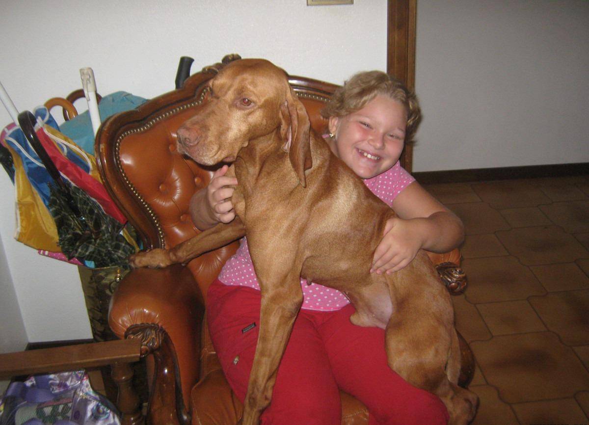Дети любимы игривой собакой. Венгерская выжла готова долго играть с детьми, терпеть их приставания. Даже причиненная боль не заставит собаку огрызнуться. Выжла – отличная возможность выпить чашечку кофе после работы, пока дети занимаются с собакой. Вред выжла может причинить только ненамеренно: случайно толкнуть или наступить на ногу.