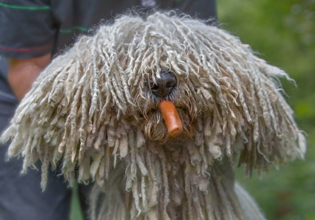 Периодически перебирайте шерсть, разделяя естественно сформированные пряди от самой кожи. Аккуратно тяните каждую «веревочку, отделяя ее от остальных. Если долго не ухаживать за шерстью комондора, но веревочки спутываются, а шерсть начинает сваливаться. Пласты очень сложно разделить и придется делать это с ножницами в руках. Чем старше собака, тем реже придется проводить процедуру «расчесывания» пальцами. Пряди будут сформированы, станут более плотными и с каждым годом лишь увеличиваются в длину.
