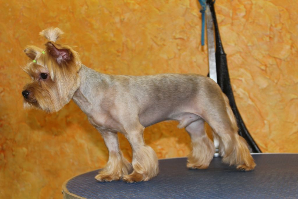 Корпус питомца остригается коротко, на лапах и хвосте длина средняя. На морде волосы остаются одной длины. Из-за ощущения создавшейся округлости даже взрослый йорк выглядит как щенок.