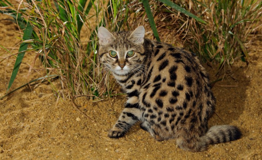 Уроженница лугов южной части Африки, кошка с черными ногами имеет удивительно круглое лицо и светло-коричневое тело с черными пятнами, которое является небольшим даже по сравнению с домашними кошками.