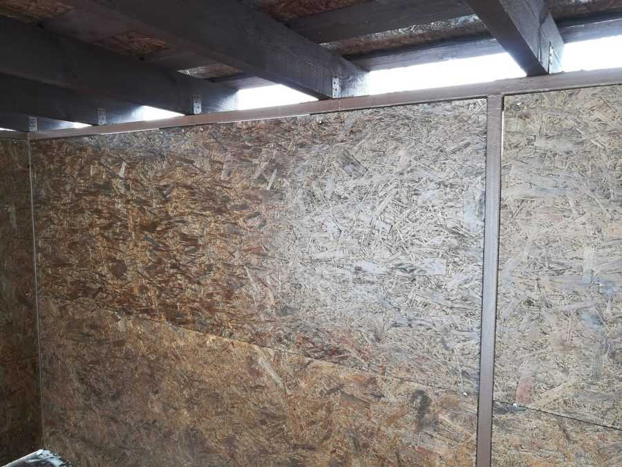 Теперь возводим стены. Две делаем из ОСБ-плит, а две — из сетки-рабицы. В одной из плит вырезаем небольшую дверцу — такую, чтобы прошел хозяин.