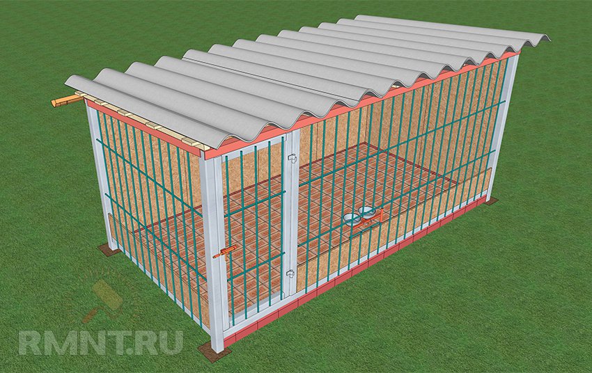 Самый бюджетный вариант для кровли — профнастил или шифер. Обычно в этих целях используют остатки от строительства дома. Единственное требование — обеспечить достаточно широкий вынос кровли в передней части, чтобы упредить попадание в вольер косого дождя