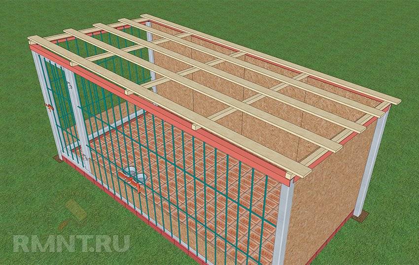 Большинство пород собак требует укрытия вольера, даже если будка защищена от дождя. При описанной конструкции заграждения настелить кровлю не составит особых проблем. Вдоль уклона с шагом 60–80 см нужно прикрутить несколько брусьев 40х40 или 50х50 мм, оперев их на верхние горизонтальные связи передней и задней стены. Сверху на брусья укладывается обрешётка по типу кровли, обычно это необрезная доска толщиной до дюйма.