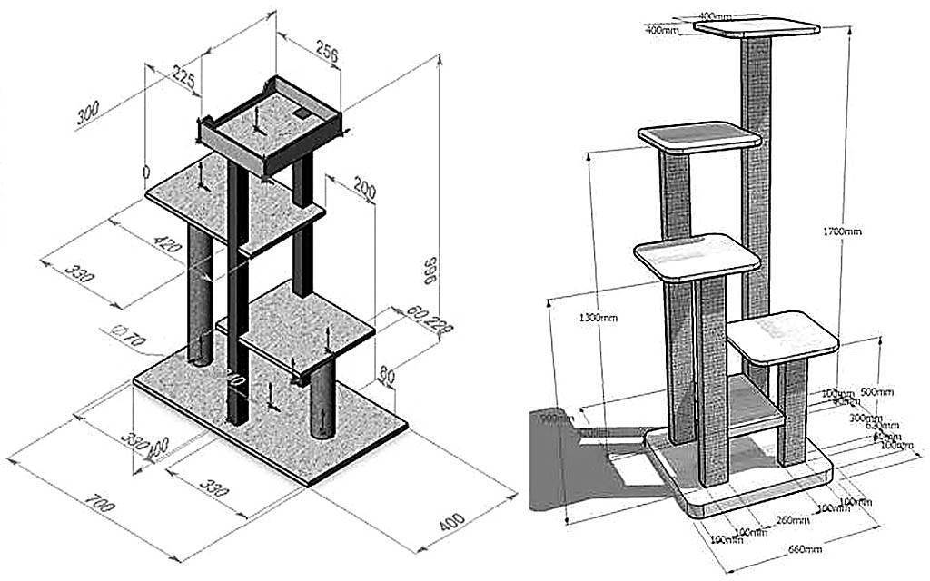 Лучше всего, если когтеточка с лежанкой и смотровой площадкой будет не прямым столбом, а разветвленным, несколько напоминая дерево, поз. 5. Такую можно соорудить из картонных труб, см. далее. И на след. рис. – чертежи когтеточек с лазалкой и площадками: слева для кошек энергичных и прыгучих, а справа – для флегматичных и степенных.