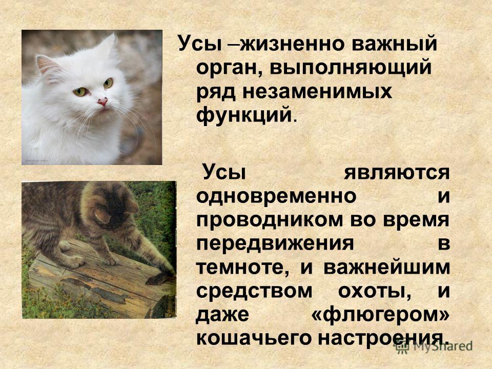 Усы –жизненно важный орган, выполняющий ряд незаменимых функций. Усы являются одновременно и проводником во время передвижения в темноте, и важнейшим средством охоты, и даже «флюгером» кошачьего настроения.