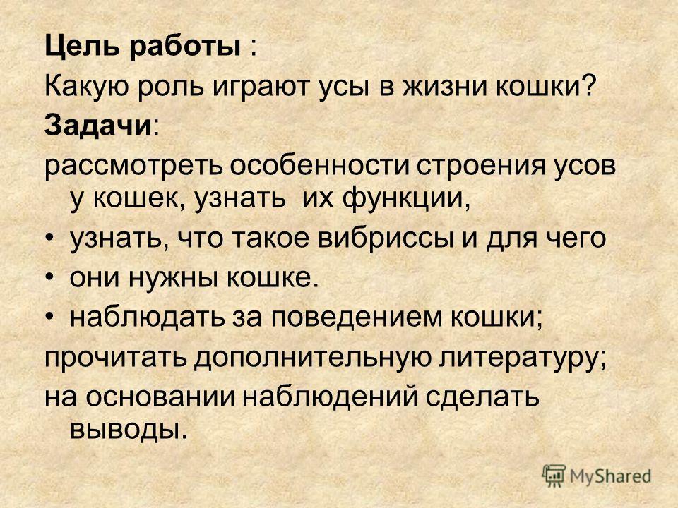 Цель работы : Какую роль играют усы в жизни кошки? Задачи: рассмотреть особенности строения усов у кошек, узнать их функции, узнать, что такое вибриссы и для чего они нужны кошке. наблюдать за поведением кошки; прочитать дополнительную литературу; на основании наблюдений сделать выводы.