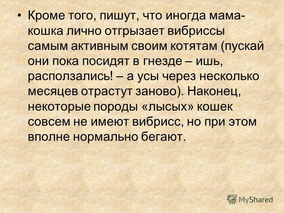 Кроме того, пишут, что иногда мама- кошка лично отгрызает вибриссы самым активным своим котятам (пускай они пока посидят в гнезде – ишь, расползались! – а усы через несколько месяцев отрастут заново). Наконец, некоторые породы «лысых» кошек совсем не имеют вибрисс, но при этом вполне нормально бегают.
